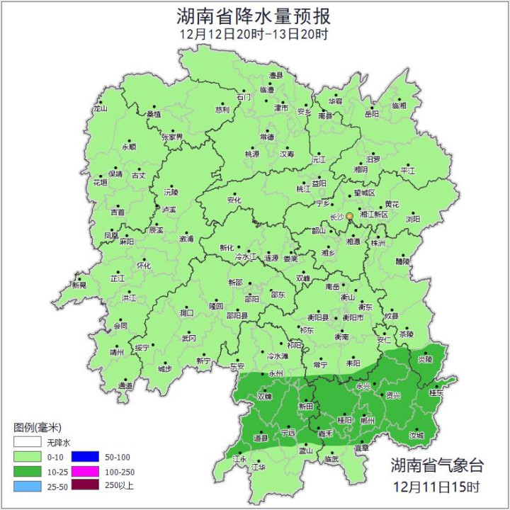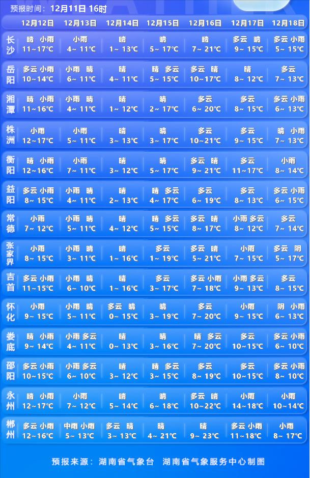 12月12日白天,全省阴天转小到中雨;北风2~3级加大至4~5级,局地阵风7~9级;最低气温湘北5~9℃,其他地区11~14℃;最高气温湘南16~18℃,其他地区11~16℃。